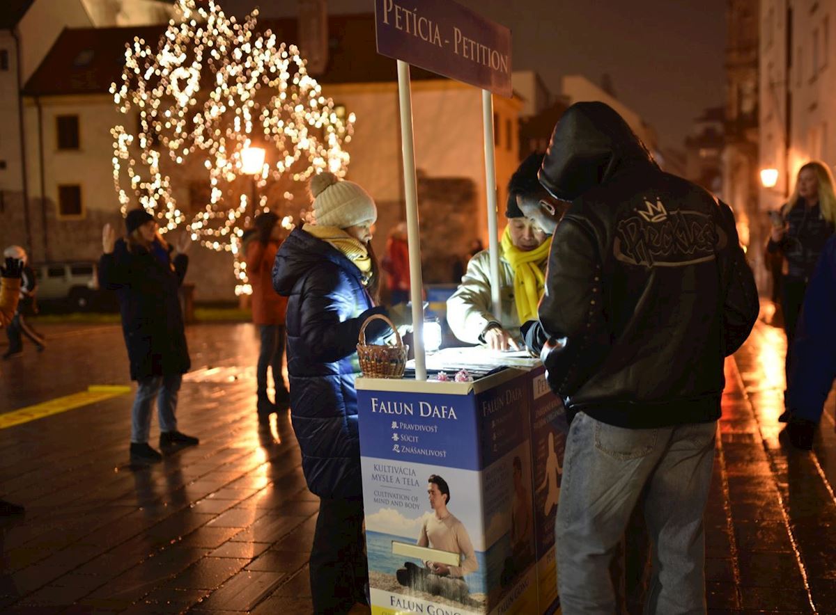 Andrej iz Partizanske i njegova devojka došli su da posete božićne markete u Nitri. Andrej je saznao za progon Falun Gonga sa društvenih mreža. Kad je saznao više o Falun Gongu na licu mesta, odlučio je da potpiše peticiju, a njegova devojka mu se pridružila rekavši: „I ja želim da potpišem peticiju!“